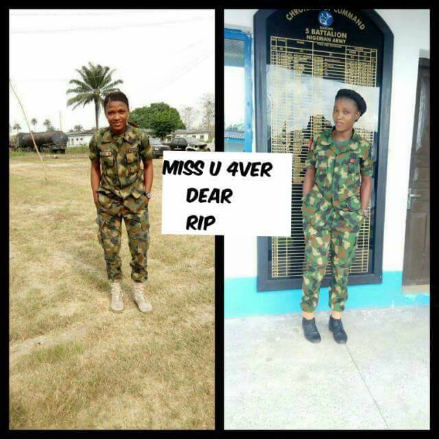 The soldier identified as Salo Roseline Tamarabrakemi, was killed in a fatal accident involving a vehicle and the motorcycle she was on while going to a market at Elele, Port Harcourt, Rivers state capital - to get things for her birthday which was the next day (Oct 11).